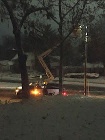 Now only was our street incredibly slick last night, but our power was out from 6:30pm - midnight. Due to some unexplained electrical mystery, our neighbors right across the street weren't affected, so they kindly invited us over for warmth, light, cocktails, and Monday Night Football. Later on, we came home to light up all the pumpkin spice candles leftover from Halloween, to read for awhile by candlelight, and to think about life without the miracle of electric everything, in the simple / complicated days of yore!